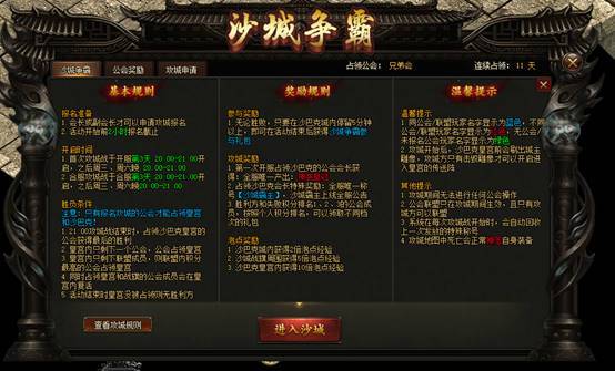 沙城争霸是游戏中游戏中最高的荣誉活动。胜利后,获胜公会可以获得大量丰富的奖励,还是一种身份的象征。活动获胜公会老大可以获得特殊称号——沙城霸主。