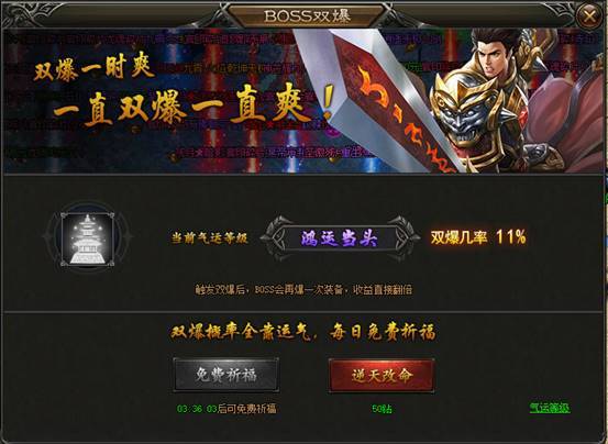 玩家每天可以通过祈福提升双爆几率,在打BOSS时概率获得2次掉落!