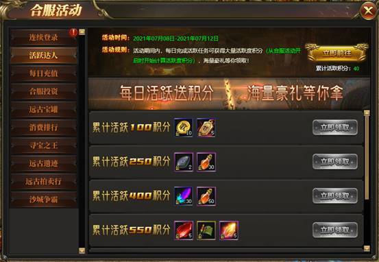 活动期间内,每日完成活跃任务可获得大量活跃度积分(从合服活动开启时开始计算活跃度积分),海量豪礼等你领取!