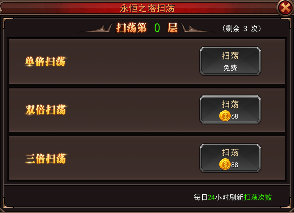 永恒之塔不限制进入次数,已通关的关卡每日最多可进行三次扫荡。,扫荡用时为当前最快通关时间,并且可以使用金币翻倍扫荡奖励。
