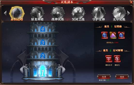 点击界面右上角的“试炼副本”即可打开副本界面,点击“永恒之塔”,即可看到永恒之塔的相关信息。